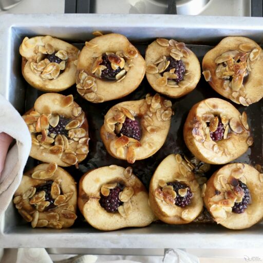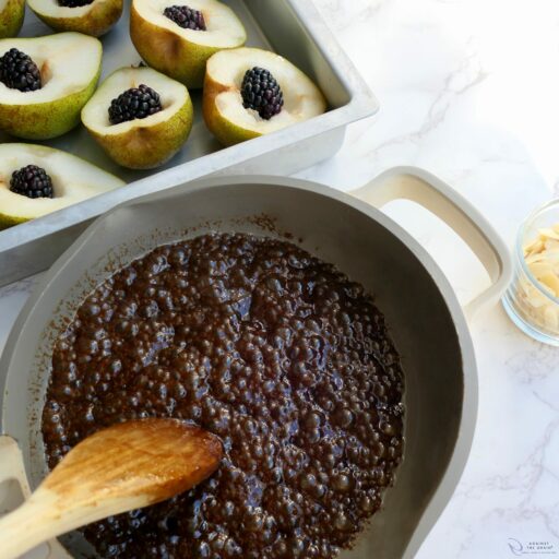 Lightly oil an oven roasting pan with coconut oil. Place the pears in the pan with the centre’s (cored side) facing upwards. Place a blackberry in each of the pear’s centre.