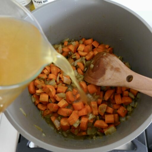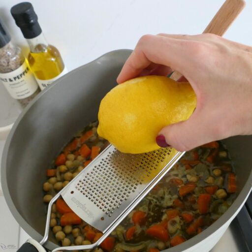 Next, add the chopped carrots and stock. Bring up to the boil and then reduce heat slightly and cook for 10–12 mins until the carrots are tender. Add the cooked chickpeas and lemon zest. Blend the soup either with an immersion blender or pour into a blender (taking care with the hot liquid). Add the plant-based milk until you have your preferred consistency. You can also leave to cool before blending.